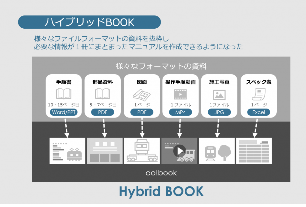 do!bookでは、今ある資料はフォーマットを整えなくてもそのまま登録ができる。さらには、PDF、Excel、Word、PowerPoint、動画、画像など作成したファイルフォーマットが異なる資料でも一つのマニュアルとして登録することができ大変驚きました。