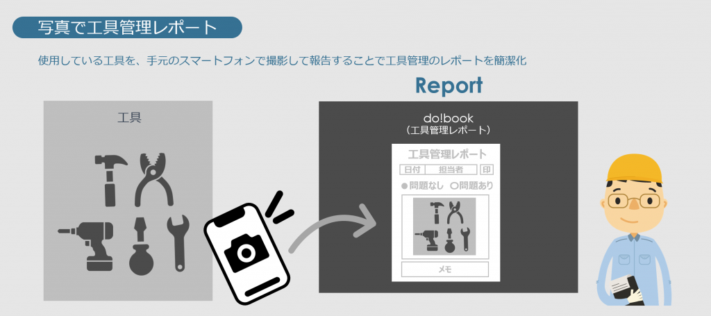 do!bookでは、写真付きレポートが簡単に作れますから工具の収納状態を撮影してレポートすれば、より正確に速くレポートでき、写真撮影するので工具を綺麗に保管する習慣もついてきました。レポートの結果は自動通知機能で自動的に管理者に報告されるように設定しています。