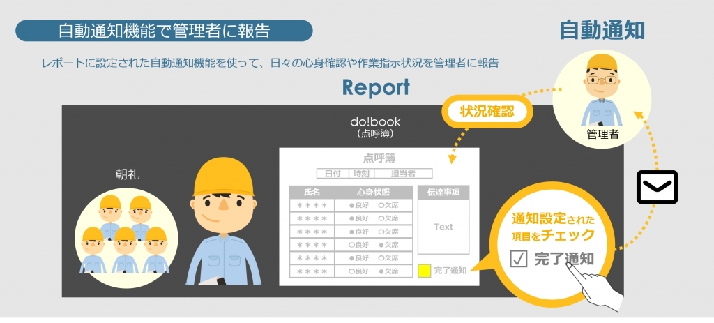 自動通知機能を使えばレポートの全項目の確認を終えて完了チェックボックスにチェックをすると管理者にメールが送付されます。管理者はメール内のリンクを開くとすぐにそのレポートにアクセスすることができるため、確実に業務が実施されたことを確認できる仕組みになっています。