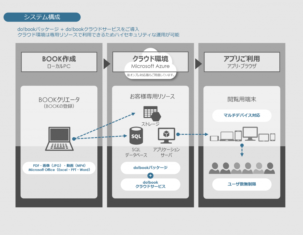 一般的なクラウドサービスでは、クラウド環境が他社と共用であったりすることが多いですが、do!bookのクラウドサービスでは、サーバ、ストレージ、データベースもすべて弊社専用のリソースを使えるということでセキュリティ上のハードルをクリアできました。