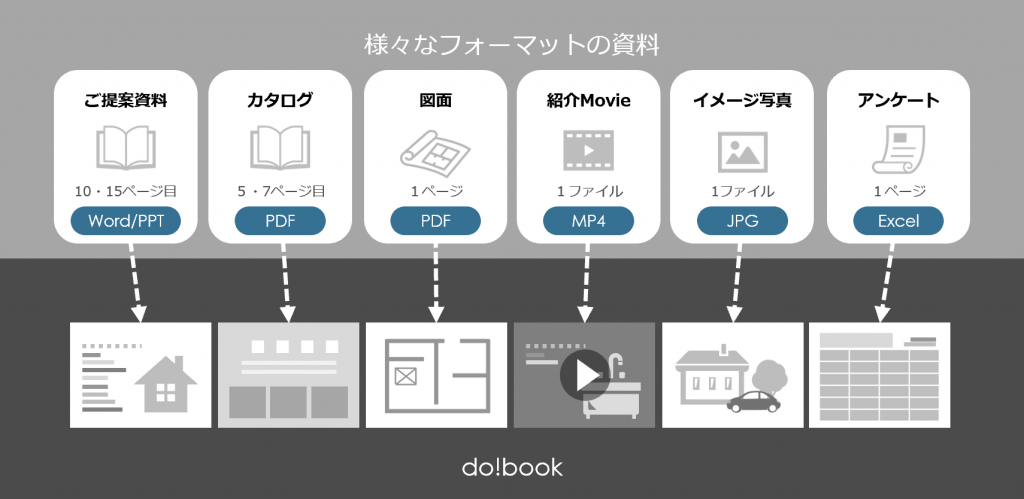 お客様ごとに異なるマニュアルなどのファイルを設定したフォルダに登録しておけば、do!bookが同期してクラウドにアップロード、Microsoft OfficeやPDF、写真・動画などフォーマットが異なるファイルでも閲覧可能にする準備ができます。