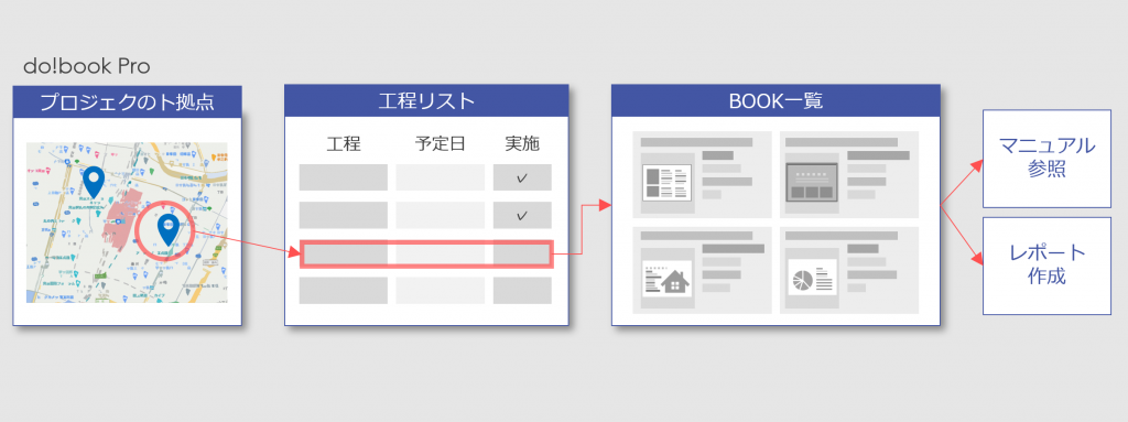 プロジェクト毎の拠点・工程などを登録し実施スケジュールを登録しておくと、現場スタッフのスケジュールにあわせてマニュアルやレポートの作成管理まで行えます。(個別カスタマイズ機能)