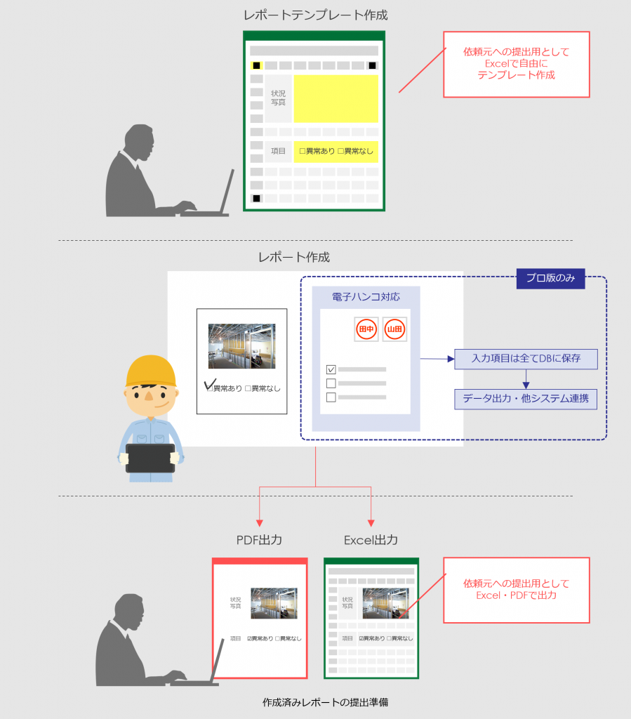 do! bookでは作成したレポートはExcelまたはPDFで完成レポートとして取り出せます。写真も既定の枠にレイアウトされているため、そのまま依頼元にご提出いただけます。