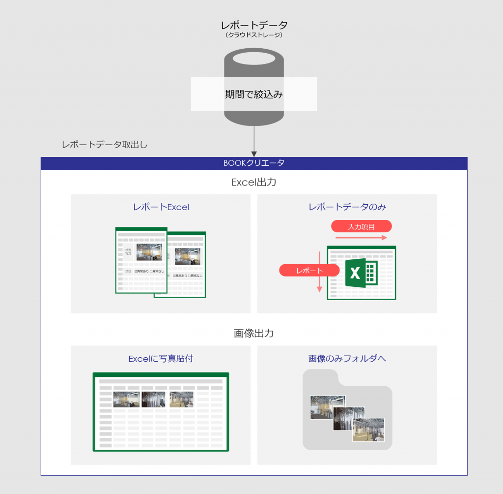 無料版・ライト版の場合、BOOKクリエータで、対象期間を指定してレポートデータをExcelでまとめて取り出すことが可能です。入力項目を横軸にすべてのレコードを1つのExcelに取り出すことでデータの分析・集計を容易にしています。