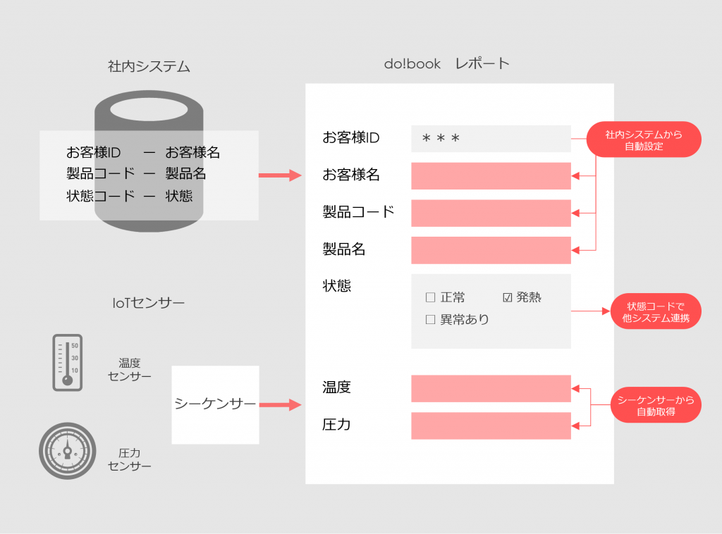 既存の社内システムにあるデータを活用すると、より便利にdo!bookでのレポート作成が可能です。例えば入力した顧客コードから顧客名、住所など自動入力したり、選択肢を既存データベースから読み込んでリスト表示したり、IoTセンサーの情報をシーケンサーから読み込んで自動設定など、様々な連携機能をわずかなカスタマイズで実現可能です。