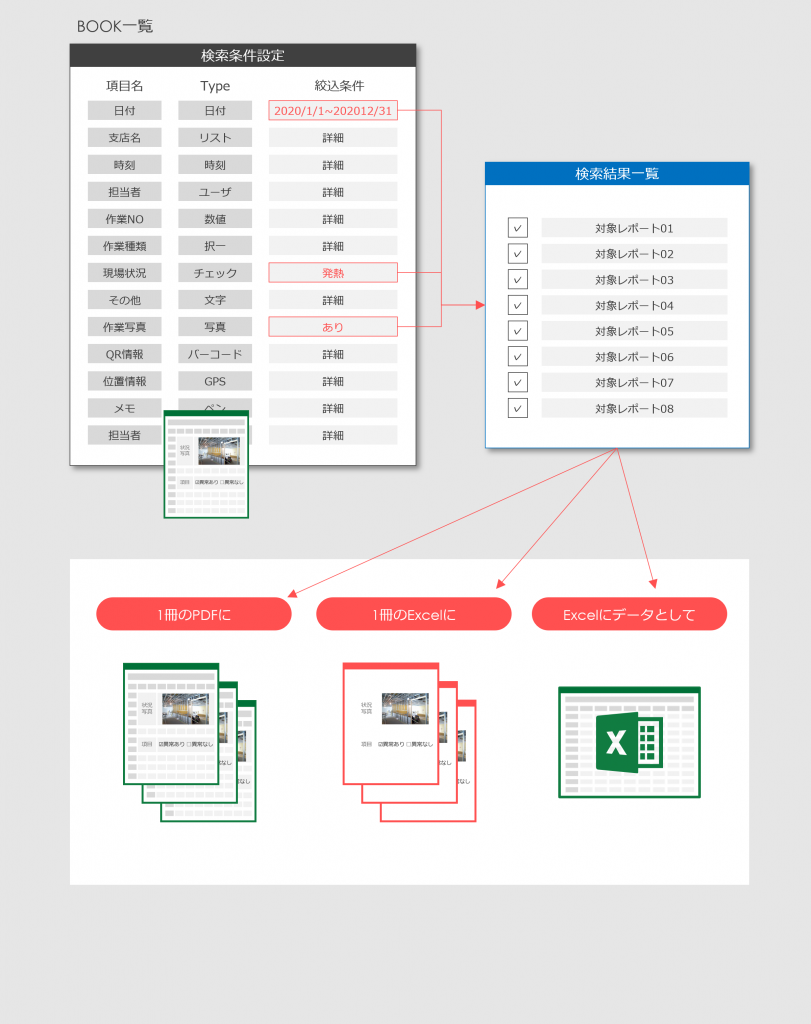 作成済みのレポートは、レポートの全ての入力項目の条件から必要な条件を指定して、絞り込み検索が可能です。例えば、あるトラブルのレポートだけ絞り込んでレポートを呼び出してデータをExcelにまとめて取り出すなど強力なレポートデータベースを構築します。