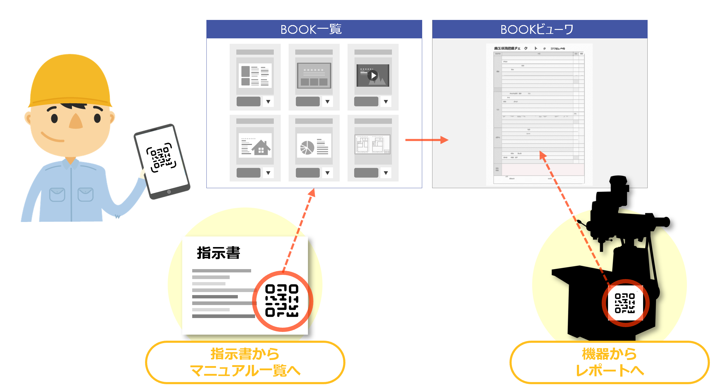 do!bookでは、お手元のスマートフォンをかざすだけで、図面やマニュアルの一覧が見えますので、すぐに必要なドキュメントを参照できます。また出張サービスなどで機器に貼り付けられたQRコードを読み込むと、その機器のメンテナンスマニュアルやメンテナンス専用レポートに直接アクセスできるため、ITスキルに関係なく、誰でもすぐに使えます。