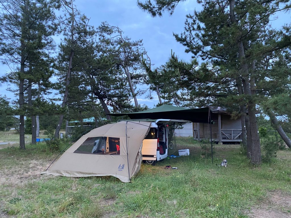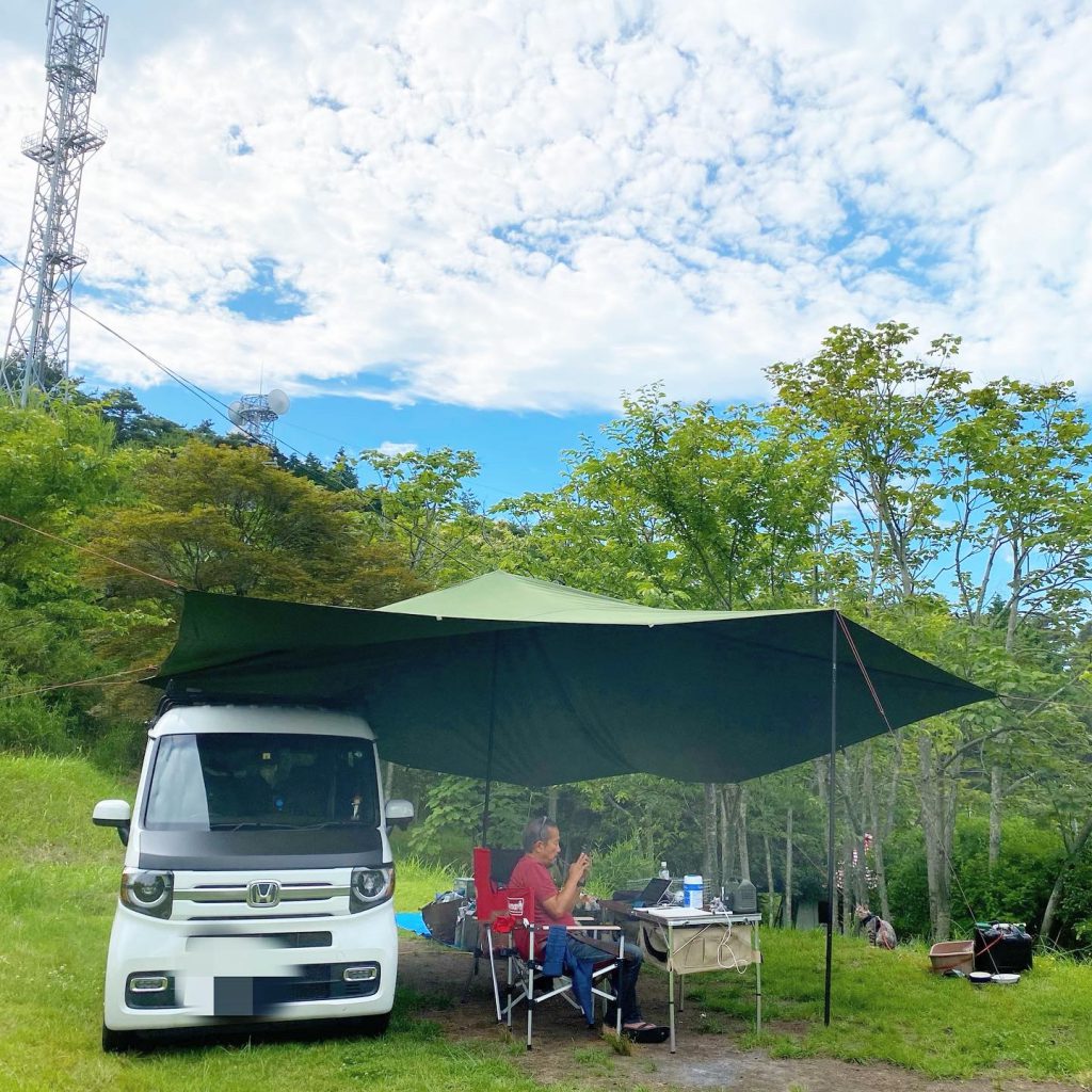 スライドドアを開けてタープを設置しておけば、日差し除けにしたり、急な雨にも対応できます。フルフラットなフロアで車中泊も快適です。