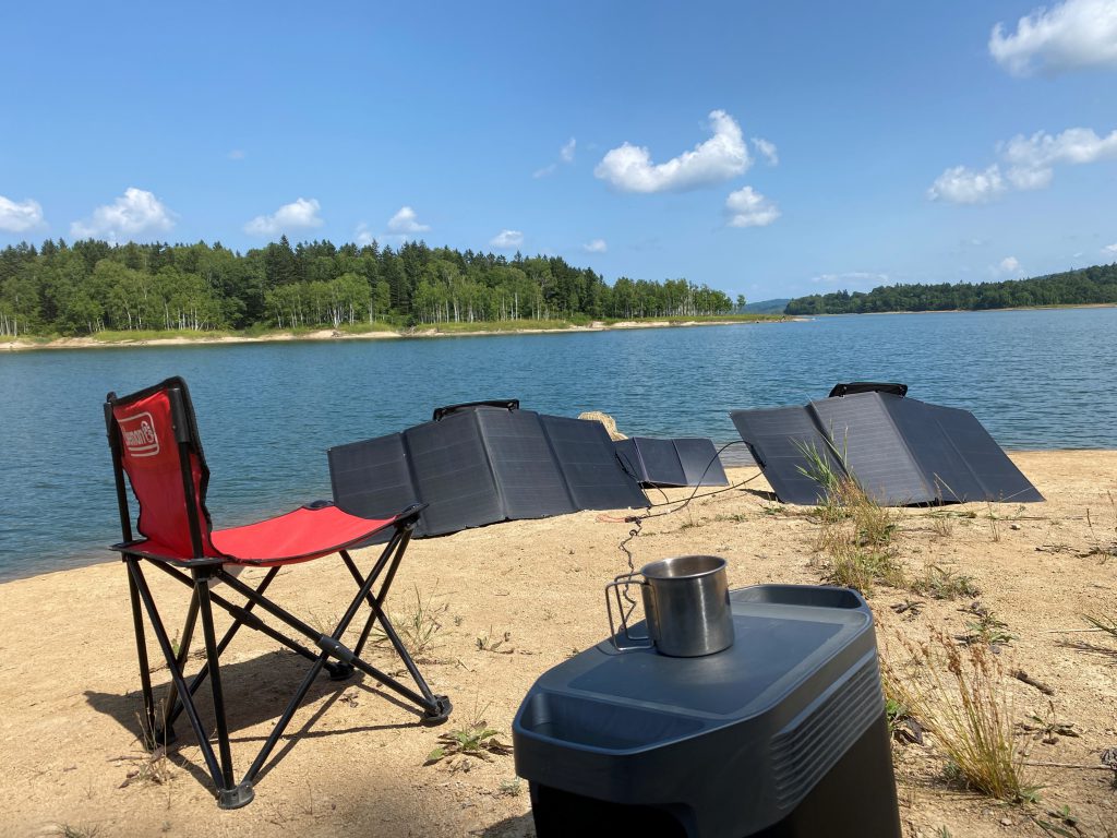 電源は晴れた日にソーラーパネルを広げて充電します。