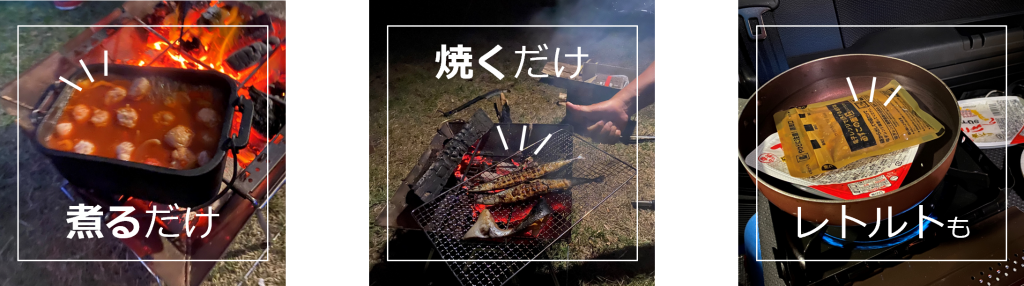 例えば、冷凍しておいたおにぎりを外に出して自然解凍して、お腹が減ったら炭火で焼いて食べるだけで、心もお腹も満たされてしまうのです。